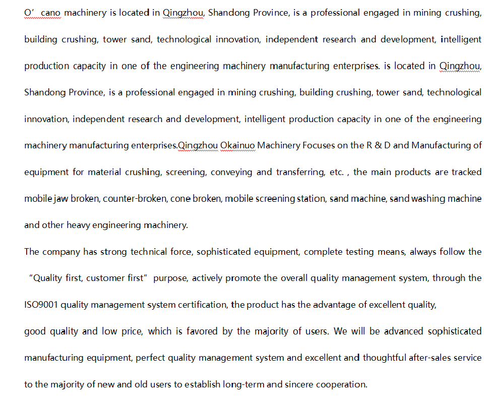 山東奧凱諾機(jī)械坐落于山東青州,是一家專業(yè)從事礦山破碎、建筑破碎、塔樓制砂、科技創(chuàng)新、自主研發(fā)、智能化生產(chǎn)能力于一體的工程機(jī)械制造企業(yè)。青州奧凱諾機(jī)械專注于物料破碎、篩分、輸送、轉(zhuǎn)運(yùn)等設(shè)備的研發(fā)與制造,主要產(chǎn)品有歐版鄂破,歐版反擊破;圓錐破,歐版給料機(jī),歐版水平篩,歐版斜篩,履帶式破碎站,履帶式篩分站等大型礦山機(jī)械。
